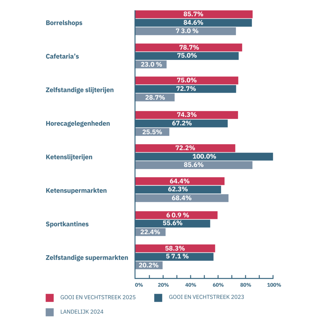 De resultaten laten zien dat de naleving in de  regio Gooi en Vechtstreek bij meerdere verkoopkanalen significant hoger ligt dan het landelijke gemiddelde. Dit geldt onder andere voor cafetaria’s, horecagelegenheden, zelfstandige slijterijen, sportkantines en zelfstandige supermarkten. Ten opzichte van 2023 zijn er bij de meeste verkoopkanalen geen duidelijke veranderingen zichtbaar. Alleen bij ketenslijterijen is sprake van een significante  daling ten opzichte van de vorige meting, van 100% naar 72%.