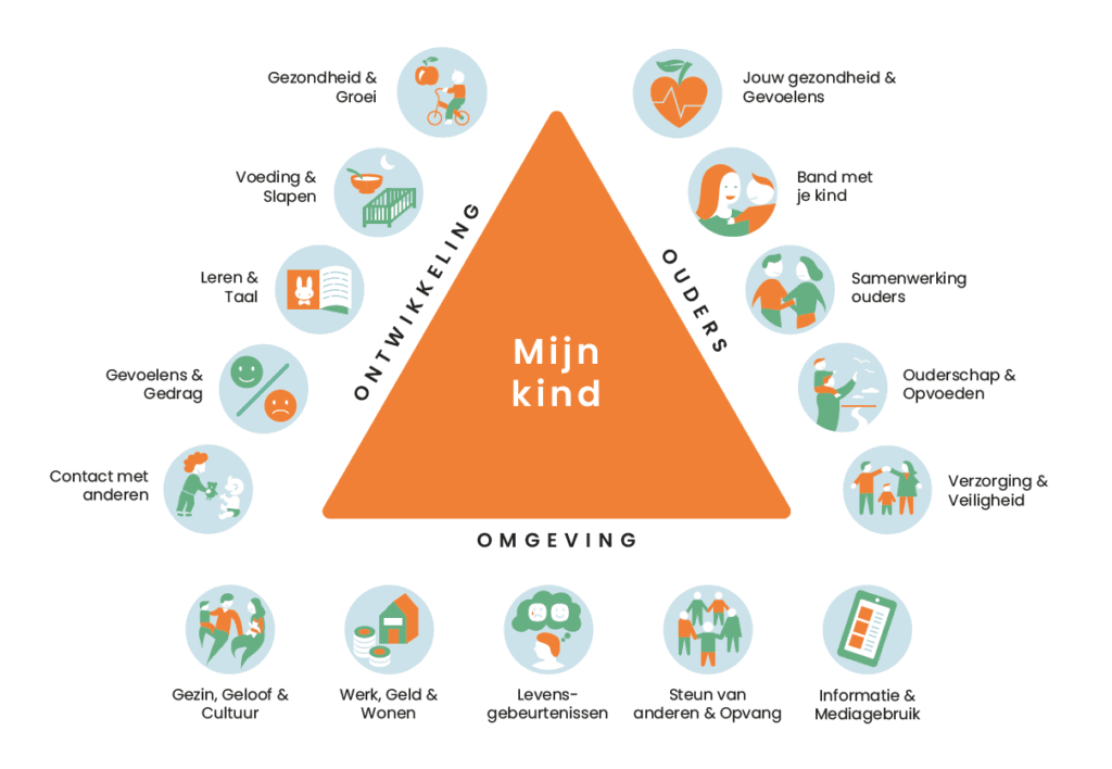 Omdat geen kind of ouder hetzelfde is, bespreken we graag hoe de ontwikkeling van je kind verloopt, hoe je als ouder de opvoeding ervaart en hoe jullie omgeving eruit ziet. Met behulp van de driehoek ‘mijn kind’ praten we over de belangrijkste onderwerpen en kijken we samen naar de zorg die bij jullie gezin past.