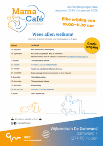 In Huizen is elke vrijdag van 10.00 tot 11.30 uur het Mamacafé geopend in wijkcentrum De Damwand (Damwand 1). In de komende periode staan er weer leuke activiteiten op het programma.